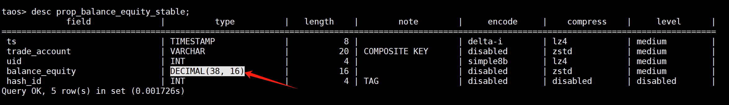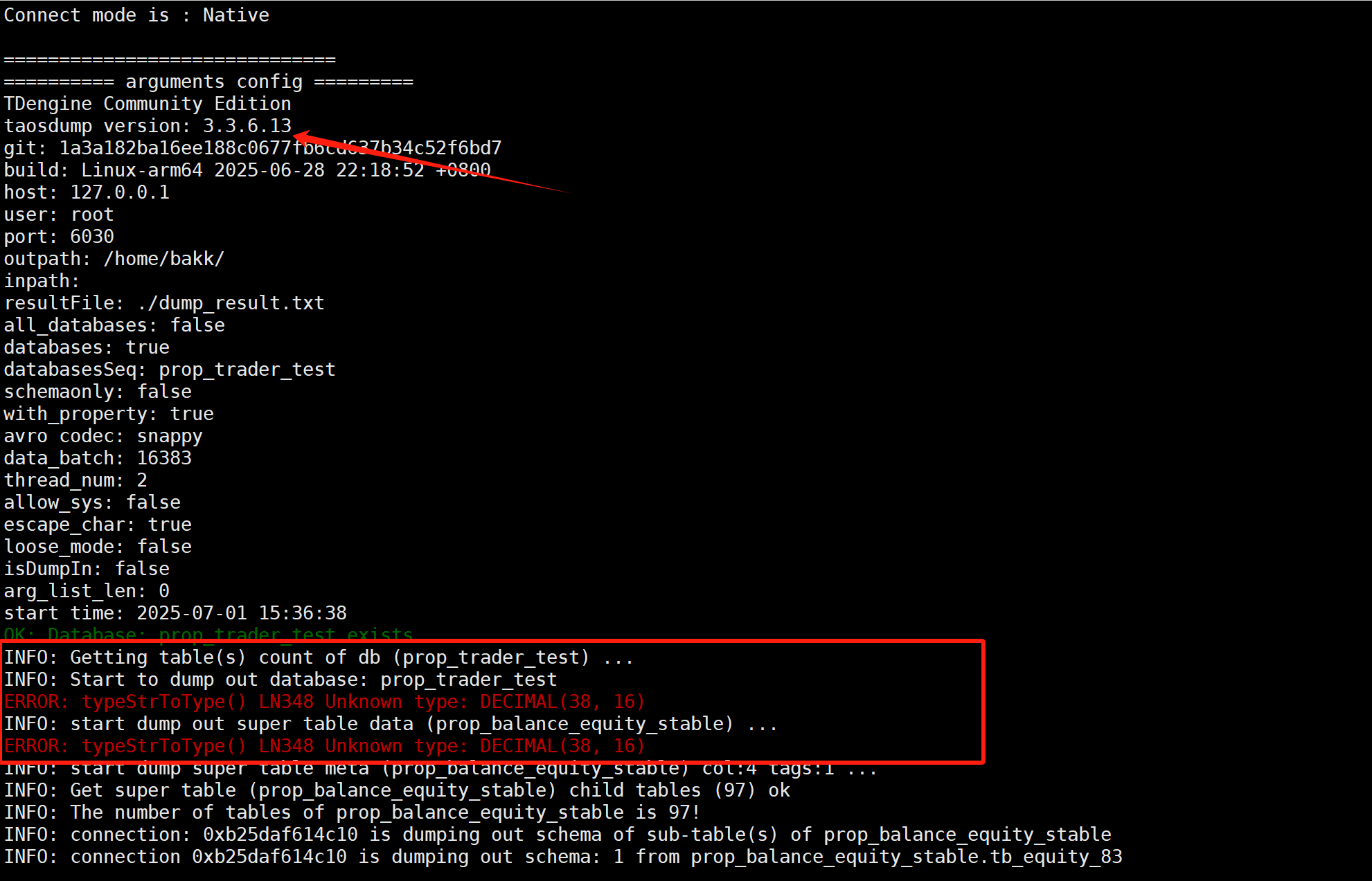超级表中有DECIMAL(38, 16)数据列,执行taosdump命令报**ERROR: typeStrToType() LN348 Unknown type: DECIMAL(38, 16)**错误,无法进行备份