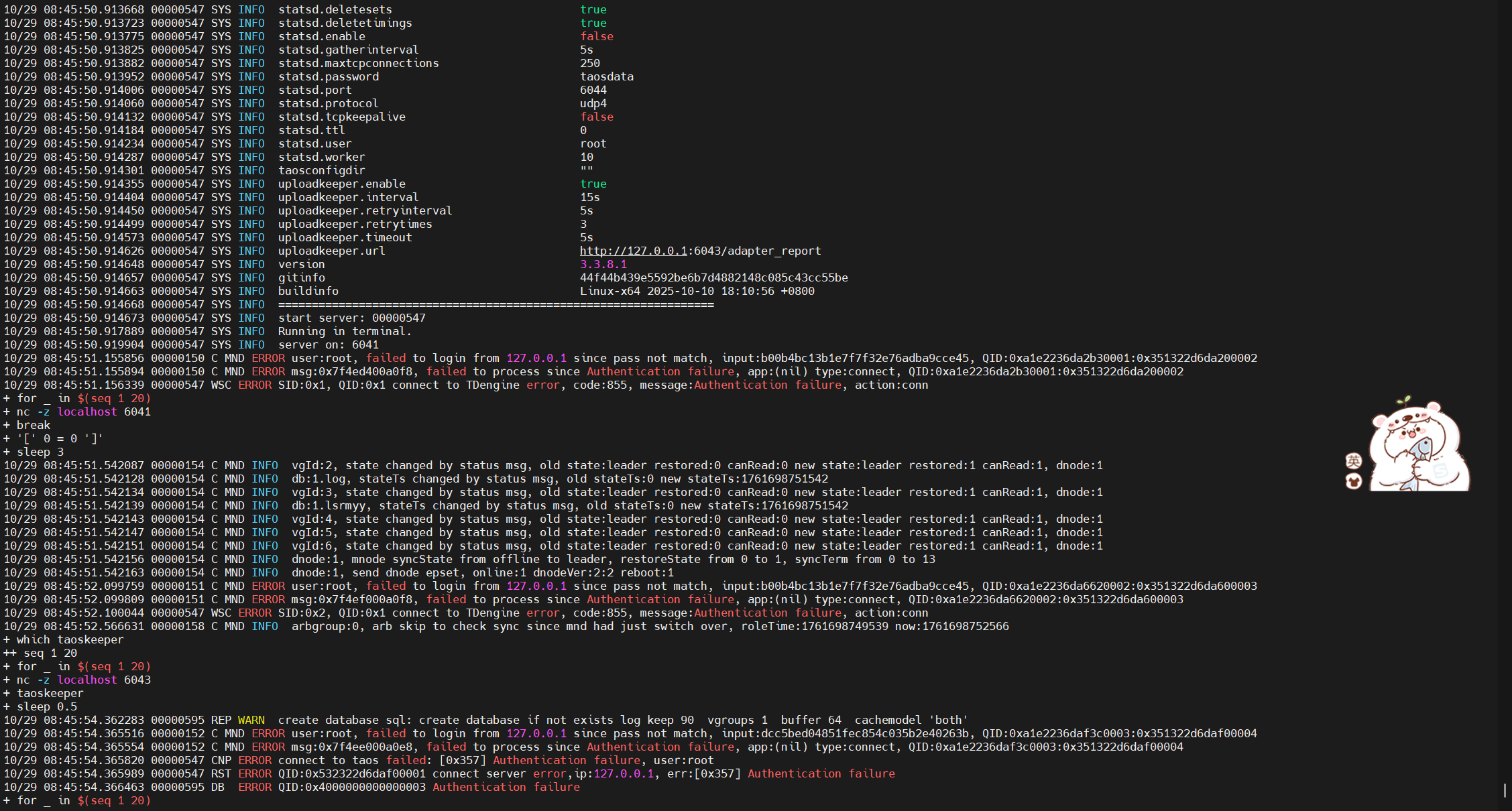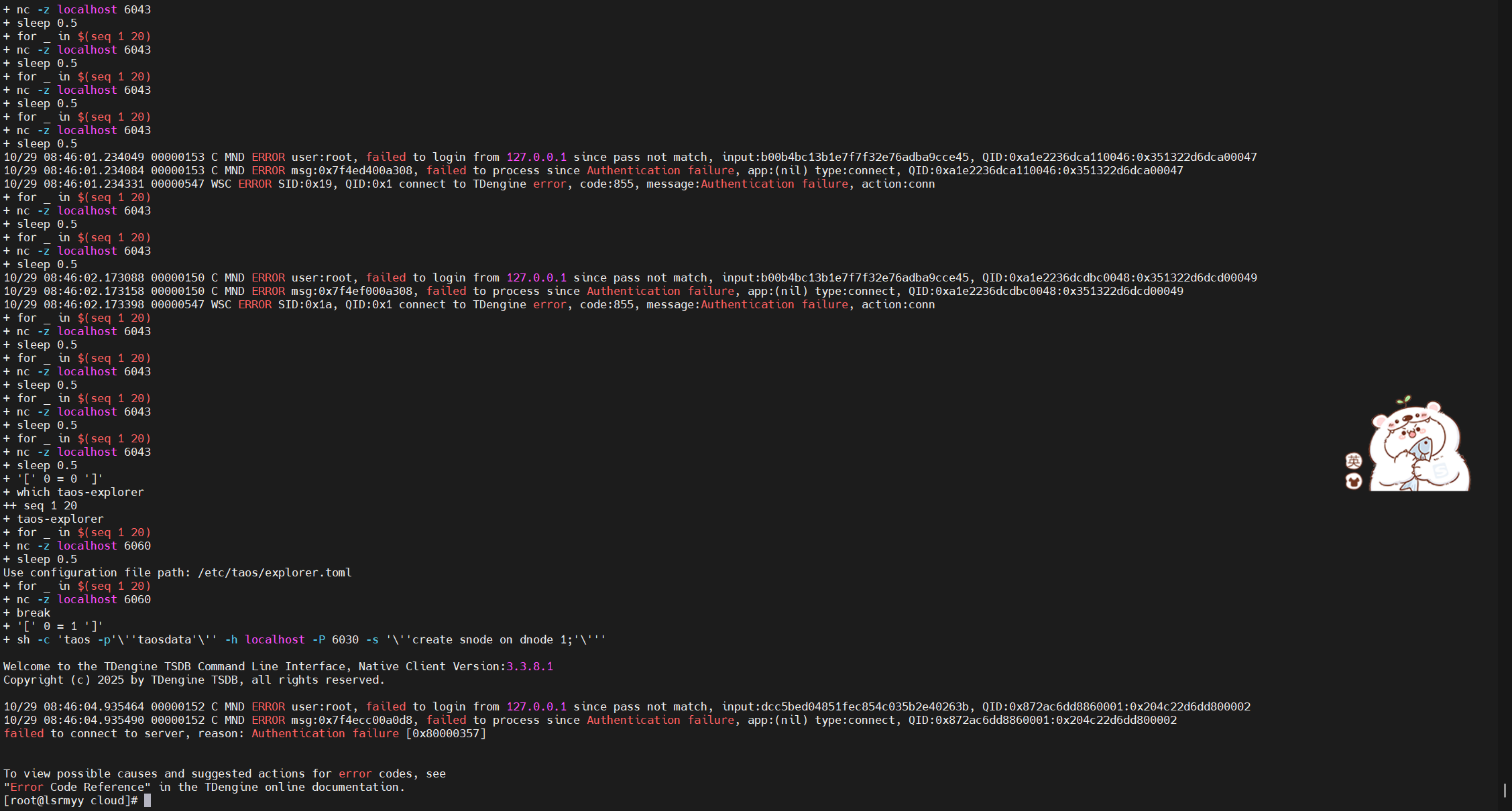 3. 如果不指定密码,脚本最后会用taosdata去校验taos服务,也会失败导致容器死亡