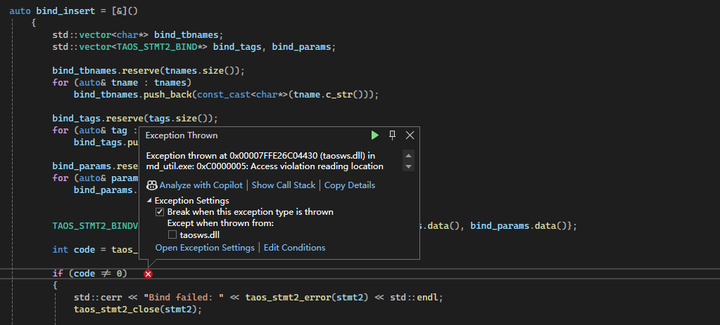 通过c api, websocket模式,批量绑定参数插入在每次插入条数比较大的时候,比如1000,taos_stmt2_bind_param 随机报越界异常