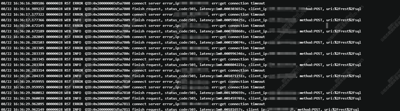 08/22 16:35:29.934927 00000028 RST ERROR QID:0x200000003d5a77fc connect server error,ip:192.168.139.14, err:get connection timeout