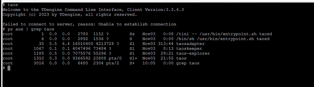 1、在ubuntu系统的服务器上通过yaml文件启动docker容器,在运行一段时间之后,docker容器的状态正常,能够通过docker exec进入到docker内部,但是进入之后运行taos命令,出现failed to connect to server, reason: Unable to establish connection。