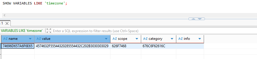 SHOW VARIABLES LIKE ‘timezone’;
