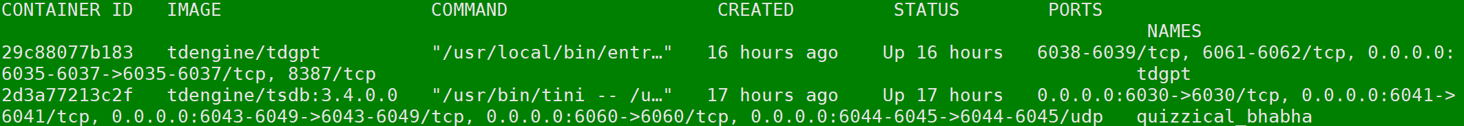 【报错完整截图】(不要大段的粘贴报错代码,论坛直接看报错代码不直观) TSDB和TDgpt以docker方式部署在一台服务器上,容器都正常启动了。