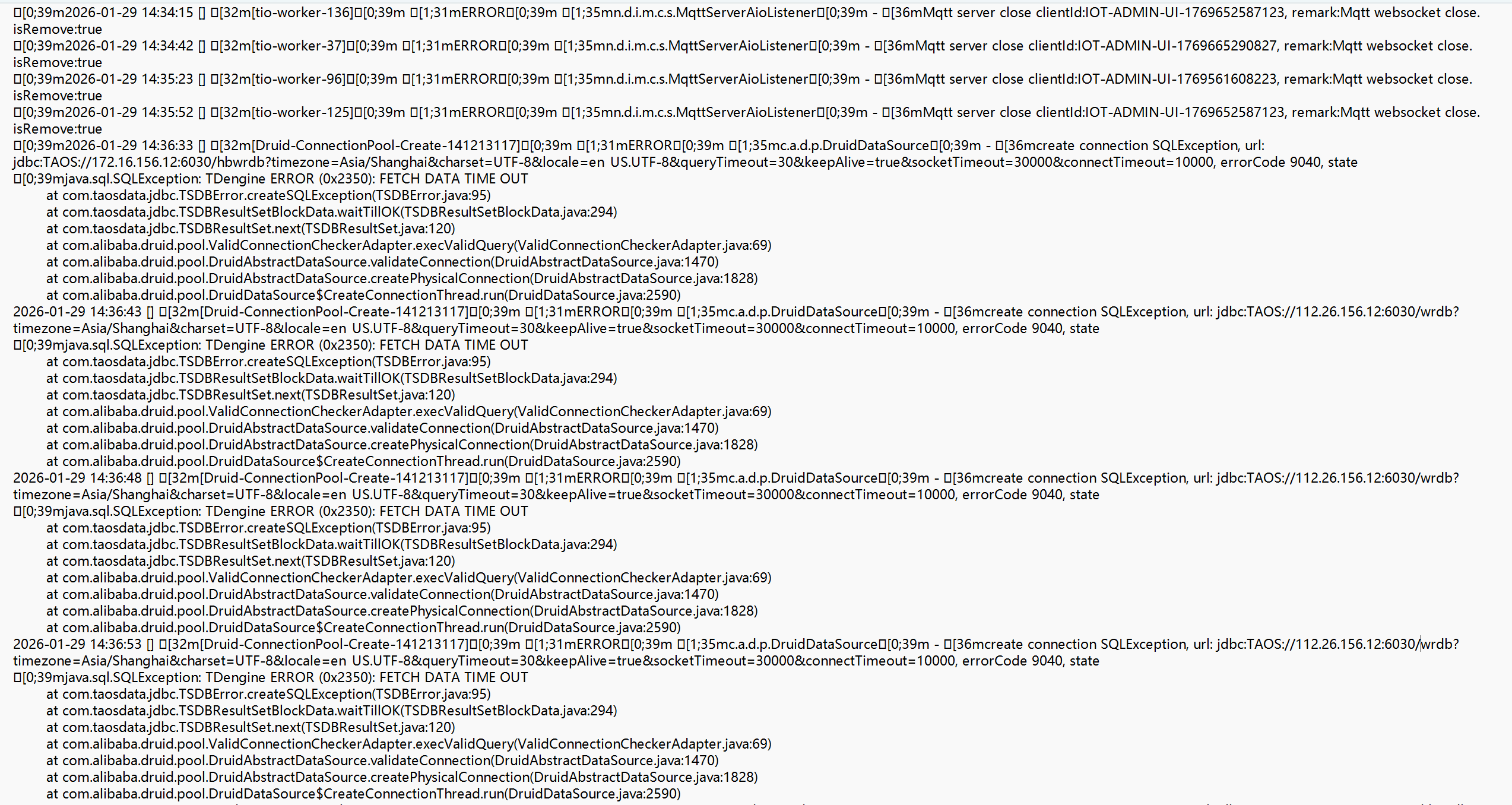 at com.alibaba.druid.pool.DruidDataSource$CreateConnectionThread.run(DruidDataSource.java:2590),然后无慢SQL 链接数也正常,就是一直抛这个异常了,重启taos后,也连不上,得重启java服务