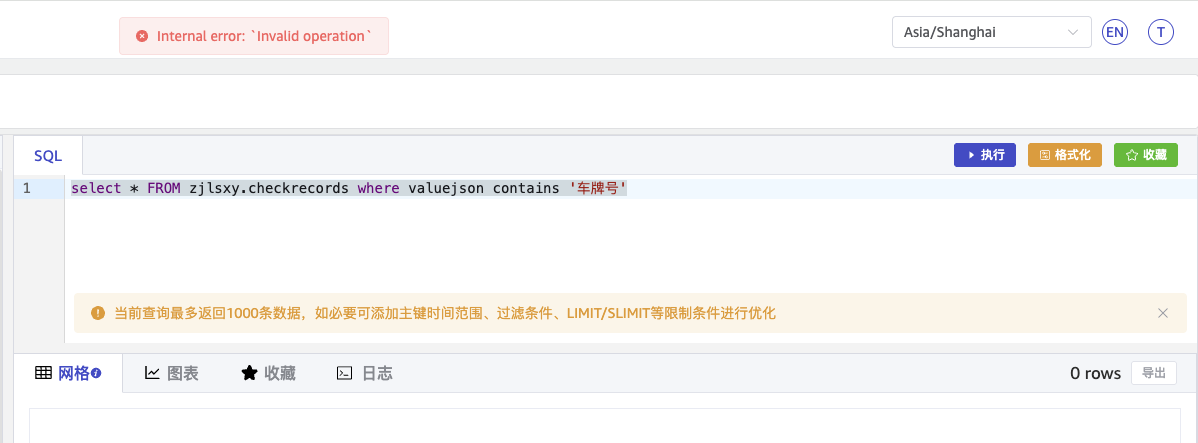 使用select * FROM zjlsxy.checkrecords where valuejson contains ‘车牌号’ 做json字段查询报错:Internal error: `Invalid operation`