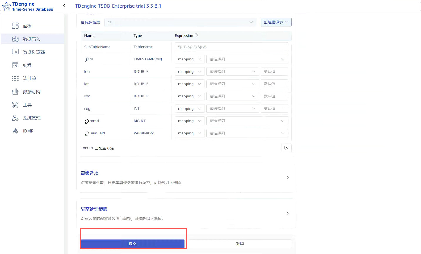 如截图所示,子表名称和字段映射均未配置,所以无法正常提交;