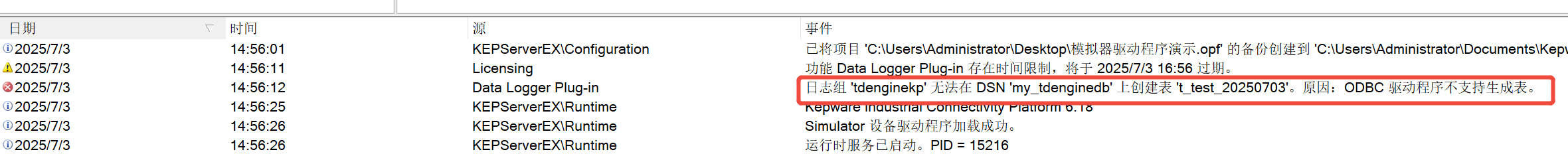 使用KEPServer6软件通过ODBC(3.3.6.13)方式访问TDengine(版本3.3.3.0 社区版)数据库,报错如下,有没有大佬知道是什么原因?Data Logger Plug-in 日志组 ‘tdenginekp’ 无法在 DSN ‘my_tdenginedb’ 上创建表 ‘t_test_20250703’。原因:ODBC 驱动程序不支持生成表。