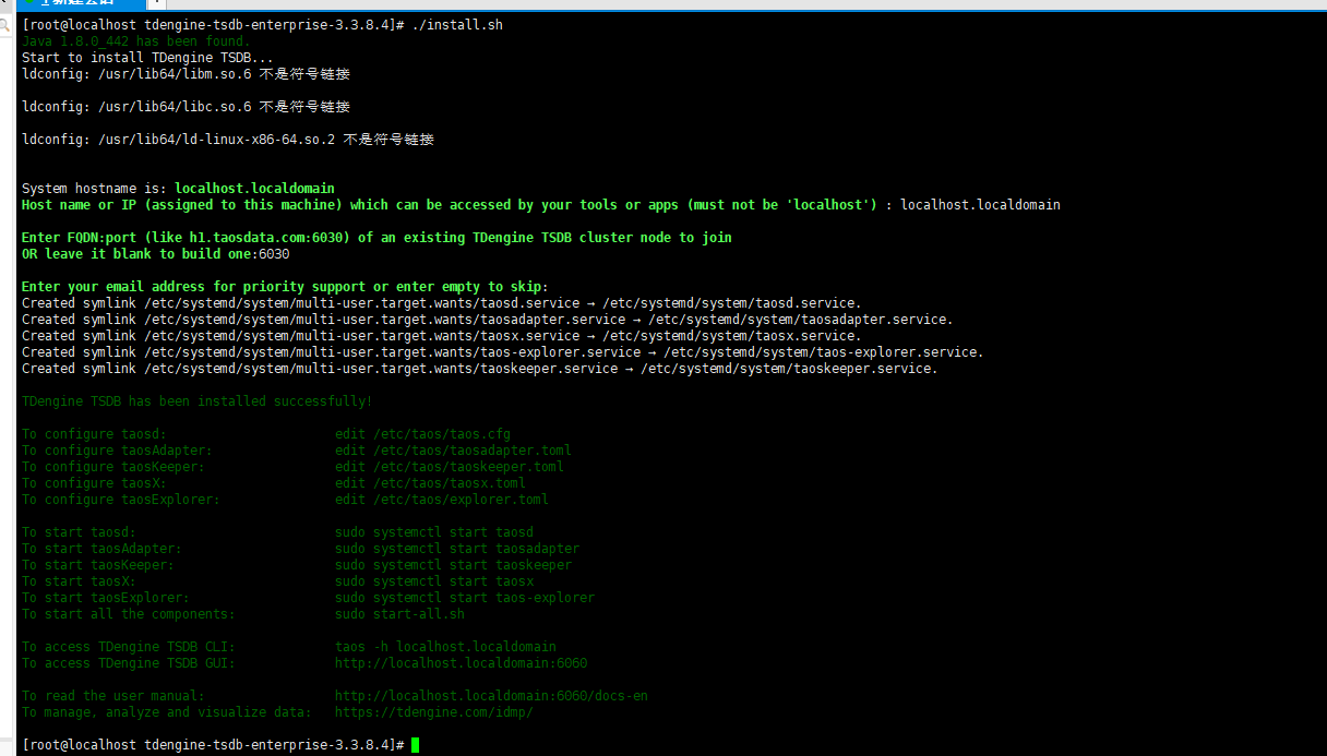 安装过程中提示libm.so.6 不是符号链接等,最终安装成功后。在/var/lib/taos没有mnode目录。systemctl start taosd可以启动,但是无法正常连接,报错