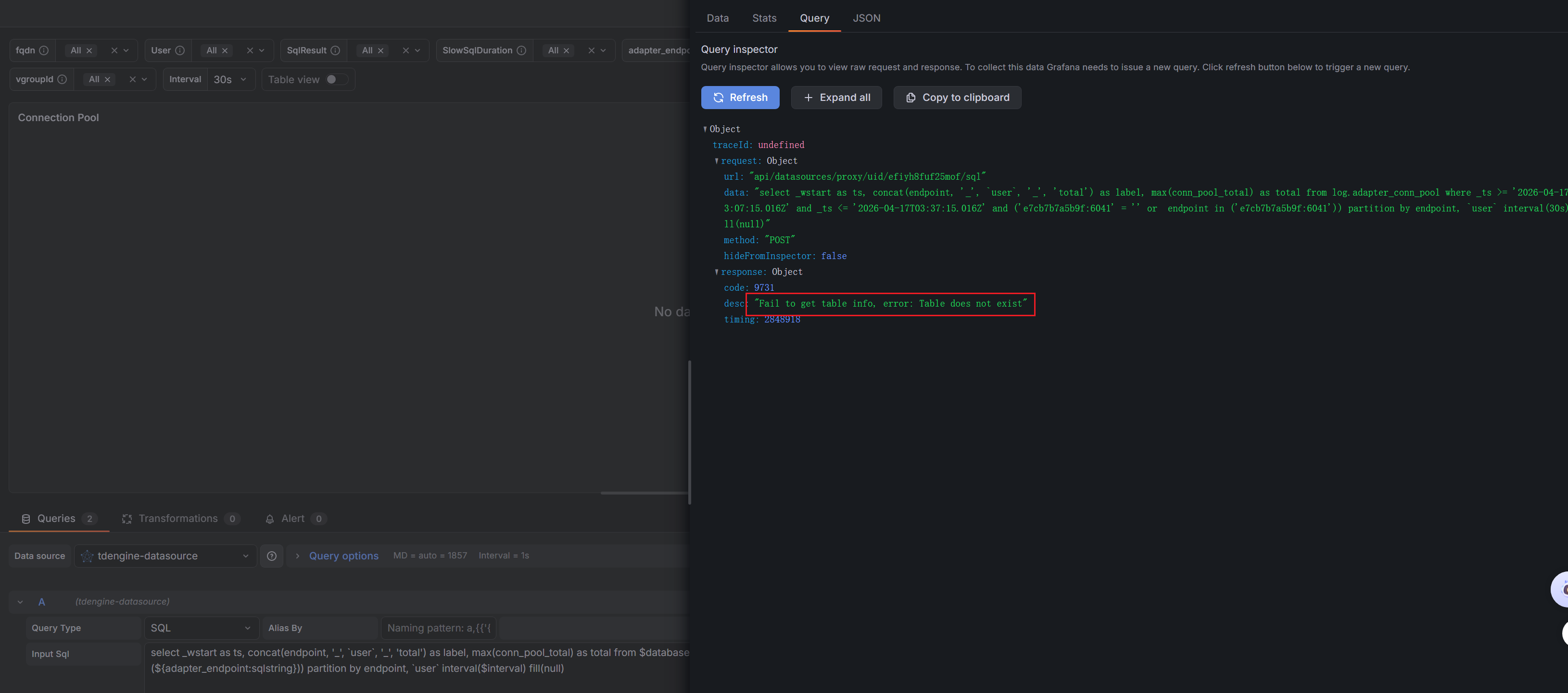 user, ‘_’, ‘total’) as label, max(conn_pool_total) as total from $database.adapter_conn_pool where _ts >= $from and _ts <= $to and (’$adapter_endpoint’ = ‘’ or endpoint in (${adapter_endpoint:sqlstring})) partition by endpoint,userinterval($interval) fill(null) -