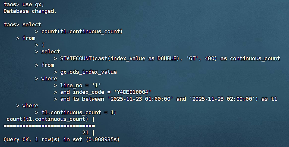 ts,STATECOUNT(cast(index_value as DOUBLE), 'GT', 400) as continuous_count