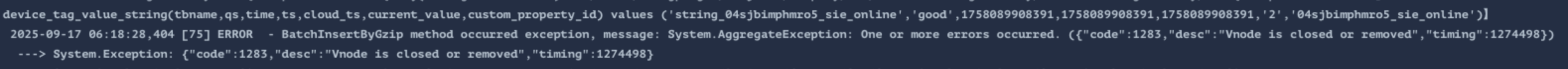 使用INSERT INTO通过超表写数据,数据库返回错误:{“code“: 1283, “desc“: “Vnode is closed or removed“, “timing“: 1274498}