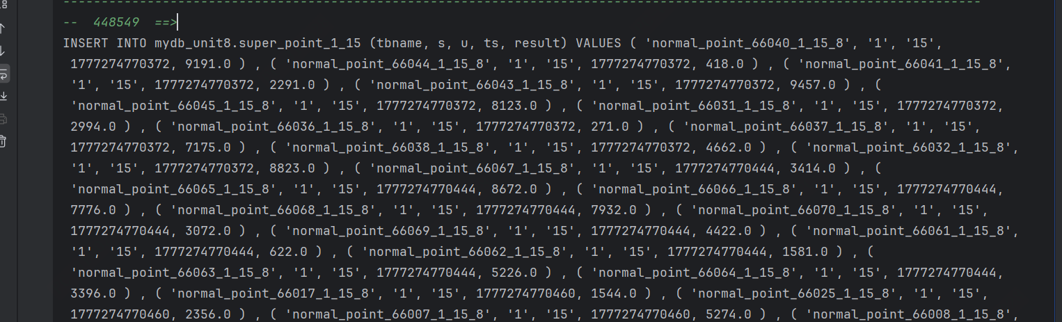 为啥我要写插入超级表 是因为之前我们最初用的是直接插入普通表 一次插入很多个子表 但是效率没有插入超级表的效率高 所以才改成了这种入库的写法