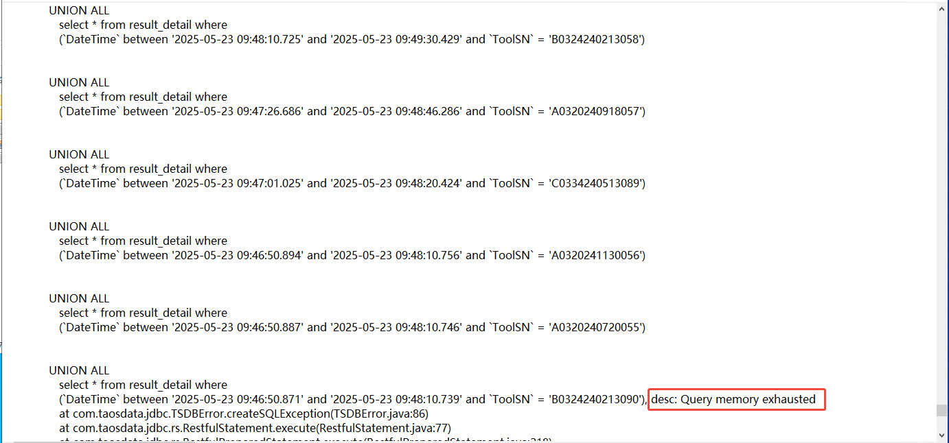目前项目需要查询58925个时间段的数据(时间段不连续)。循环查询不现实,故使用分批查询,每批查询500个时间段(每个时间段使用union all连接组成一个sql)。在此基础上总共需要查询118次,单线程循环查效率不理想,现提升至8个线程并发查询118批数据。在此过程中数据库