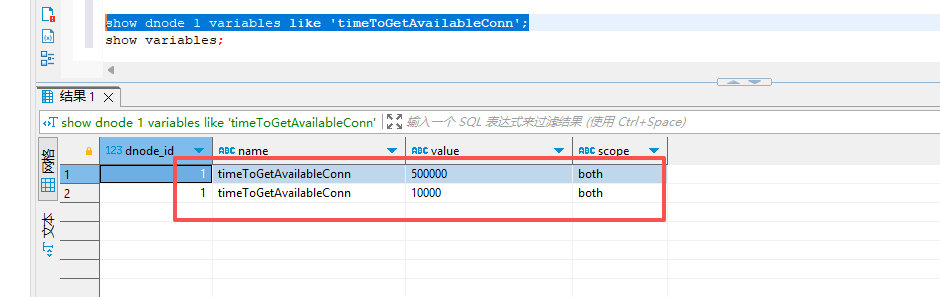 show dnode 1 variables like ‘timeToGetAvailableConn’;为什么会有两个一摸一样的配置,所有参数都是