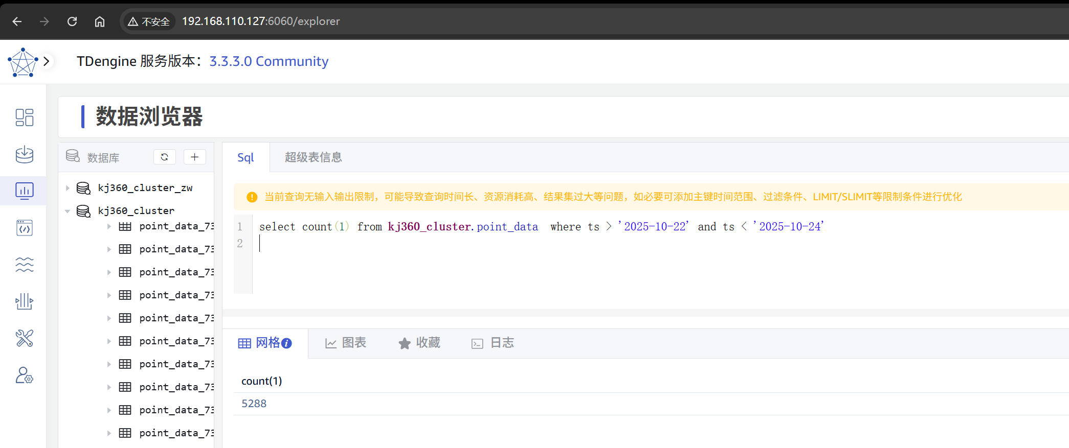 taosdump -h 192.168.110.127 -P 6030 -D kj360_cluster -o E:\\taos -S ‘2025-10-22’ -E ‘2025-10-24’