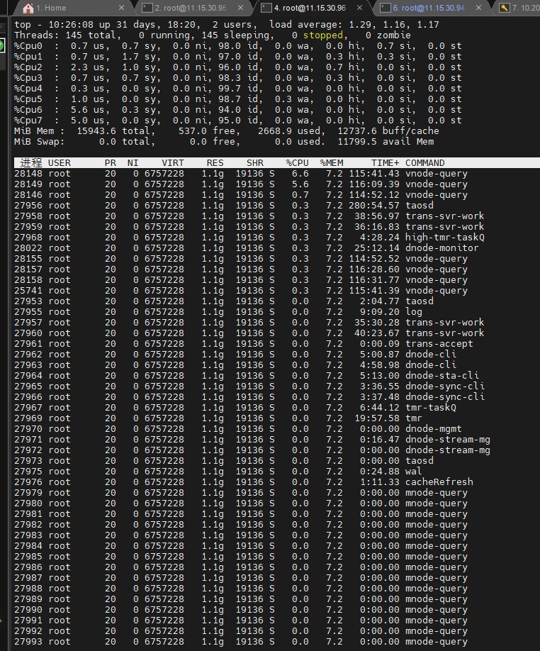 第2天早上我看2台Tdengine数据库的cpu和内存,都很低,CPU不到20%。