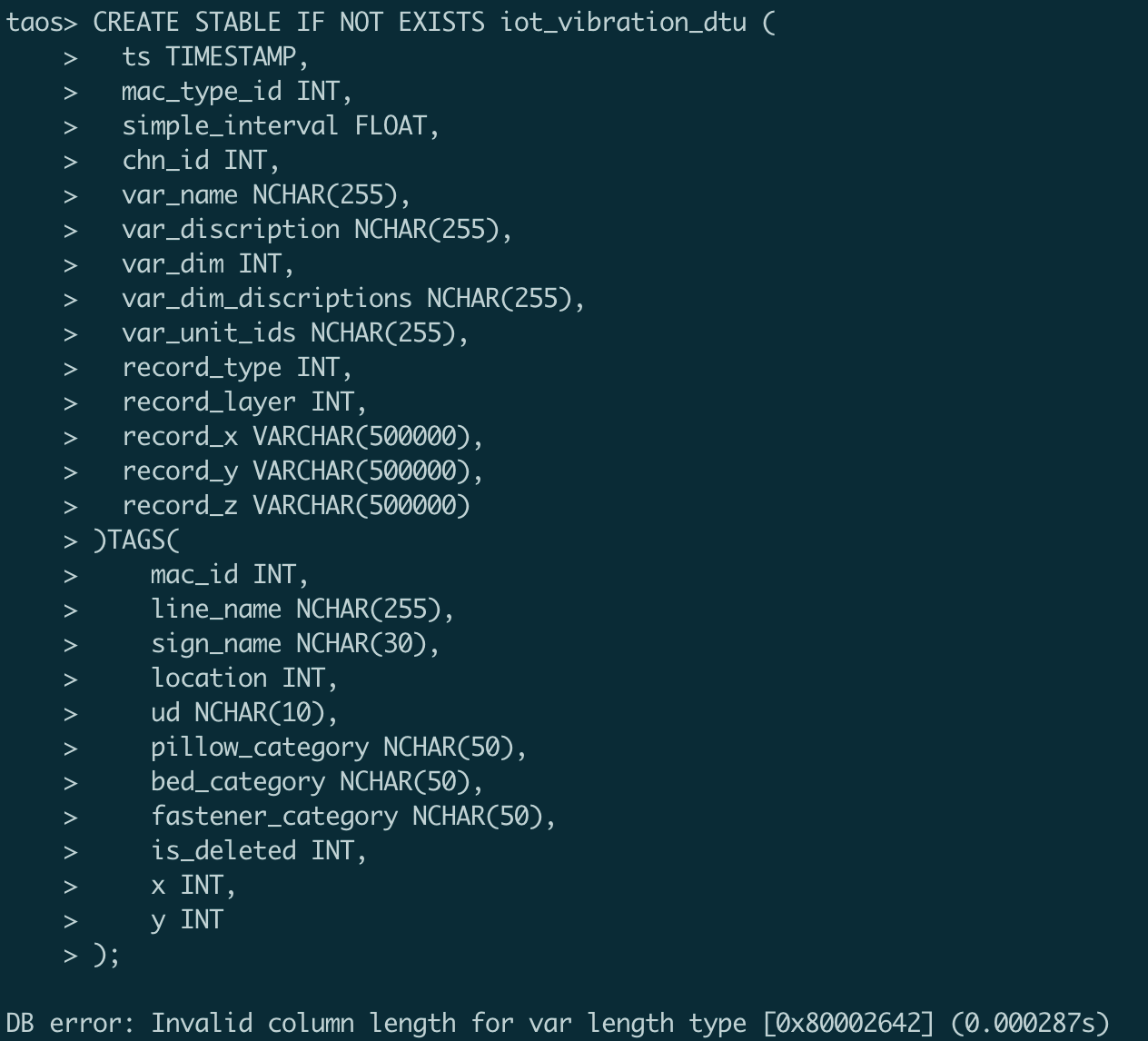我在创建表时,以下是建表语句,报错,说varchar()太大了,不能建表,但是我看网上说 tdengine3 varchar可以1MB。
