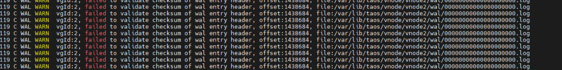 报错vgId:2, failed to validate checksum of wal entry header, offse: 1438684, file:/var/lib/taos/vnode/vnode2/wal/00000000000000000.log