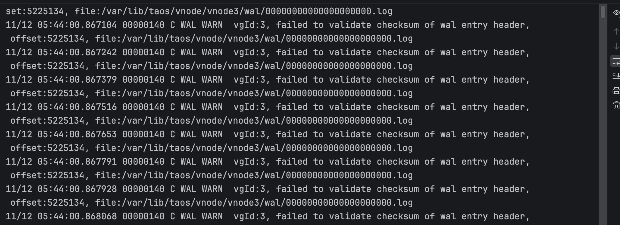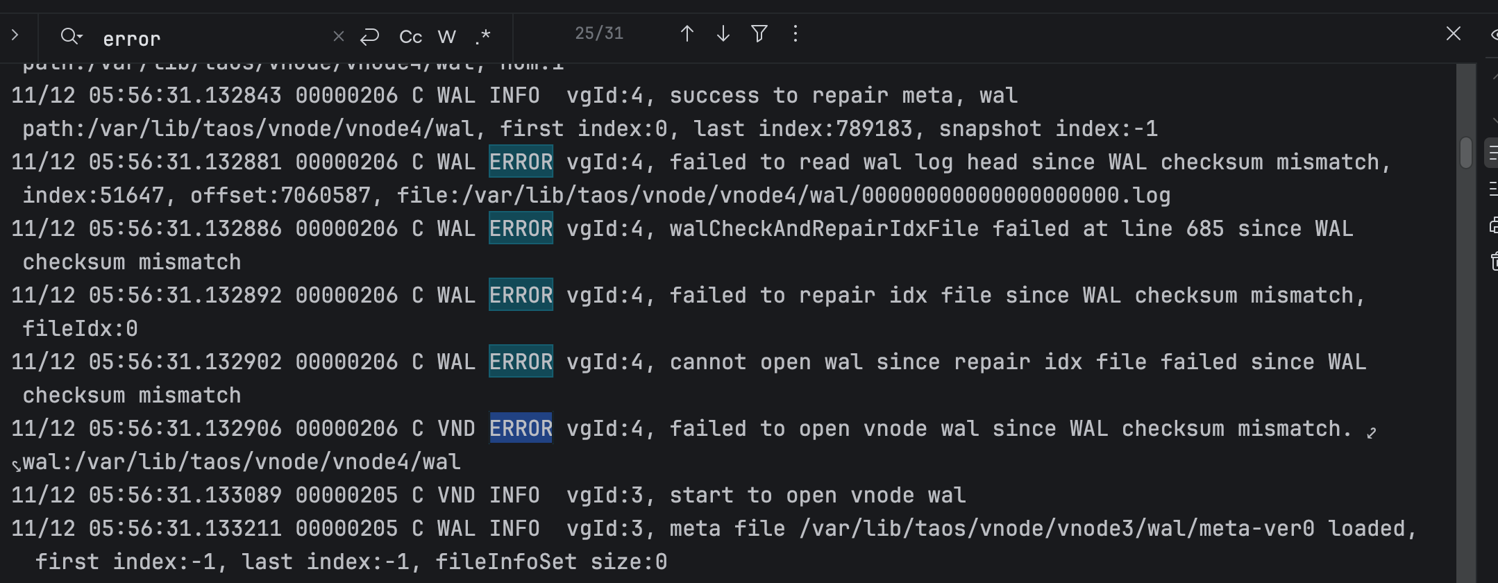 2025-11-12T05:56:33.613609642Z 11/12 05:56:33.613413 00000040 C WAL INFO vgId:1, remove old meta file /var/lib/taos//mnode/wal/meta-ver14