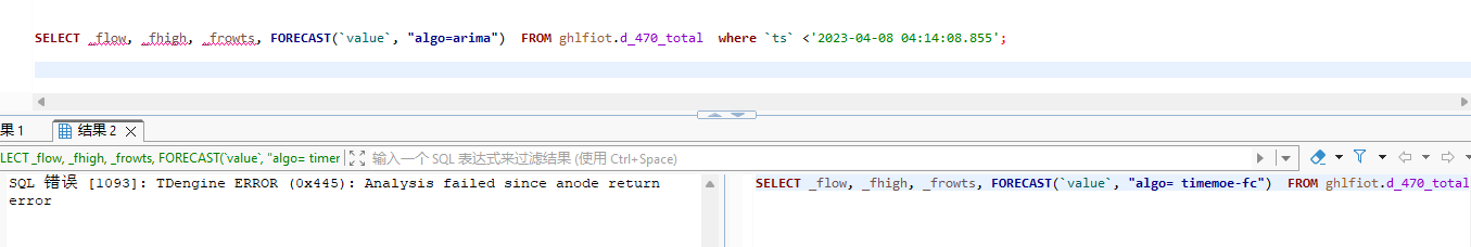 org.jkiss.dbeaver.model.sql.DBSQLException: SQL 错误 [1093]: TDengine ERROR (0x445): Analysis failed since anode return error