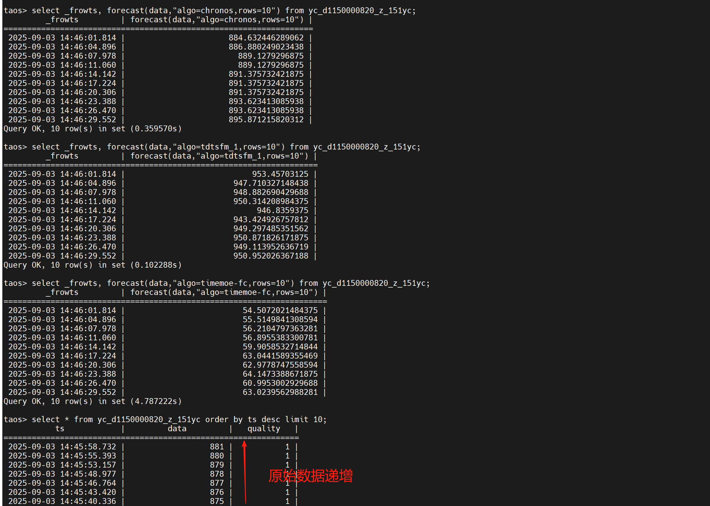 taos> select _frowts, forecast(data,“algo=tdtsfm_1,rows=10”) from yc_d1150000820_z_151yc;