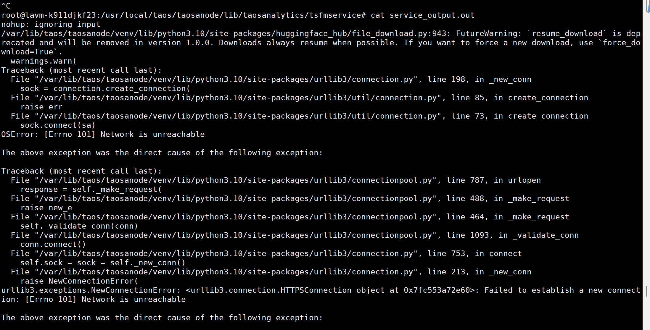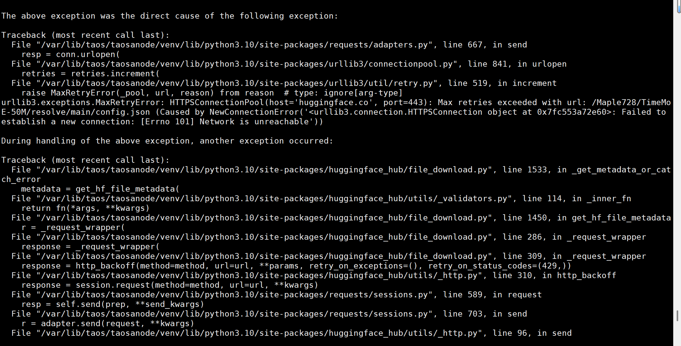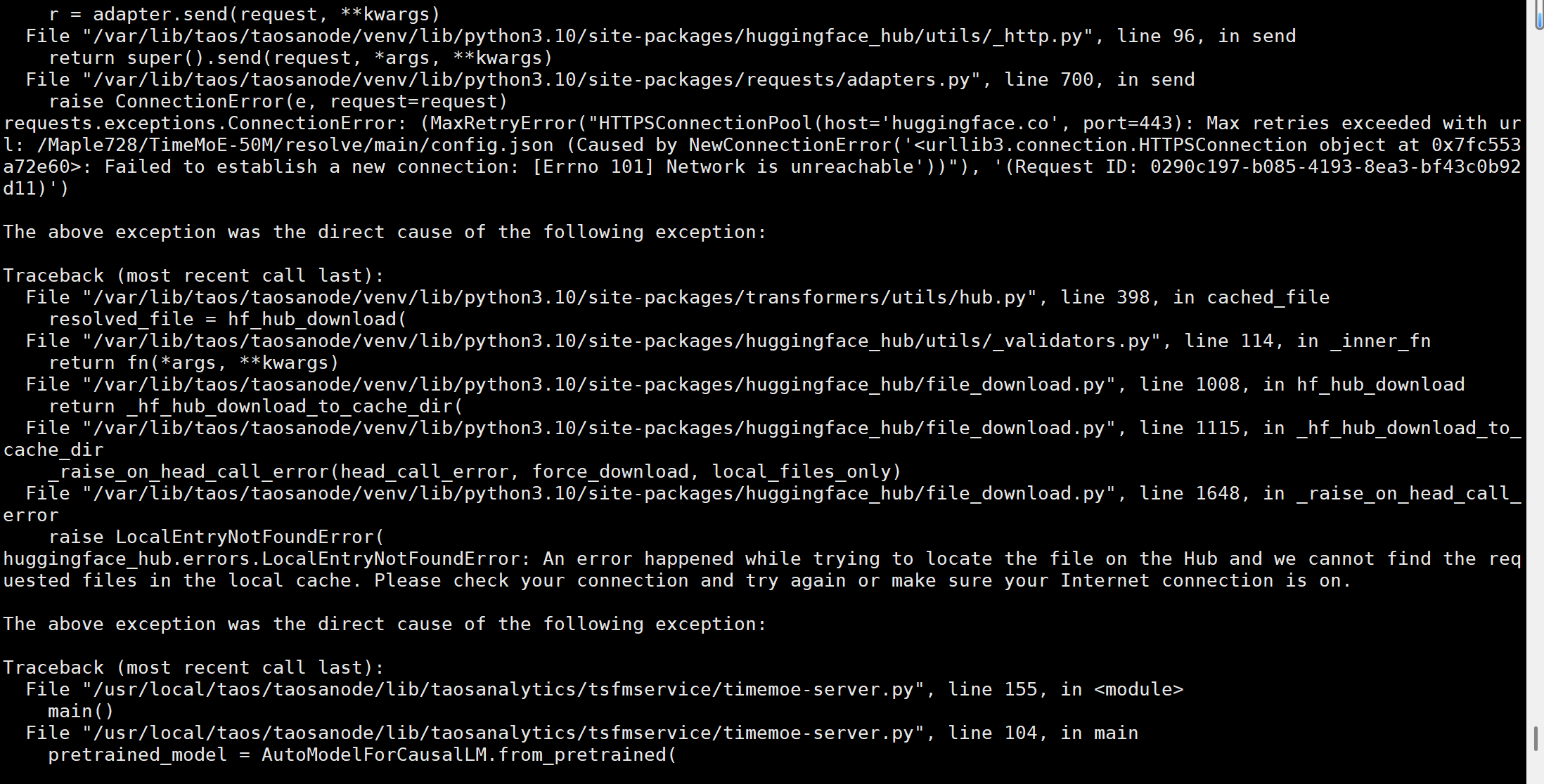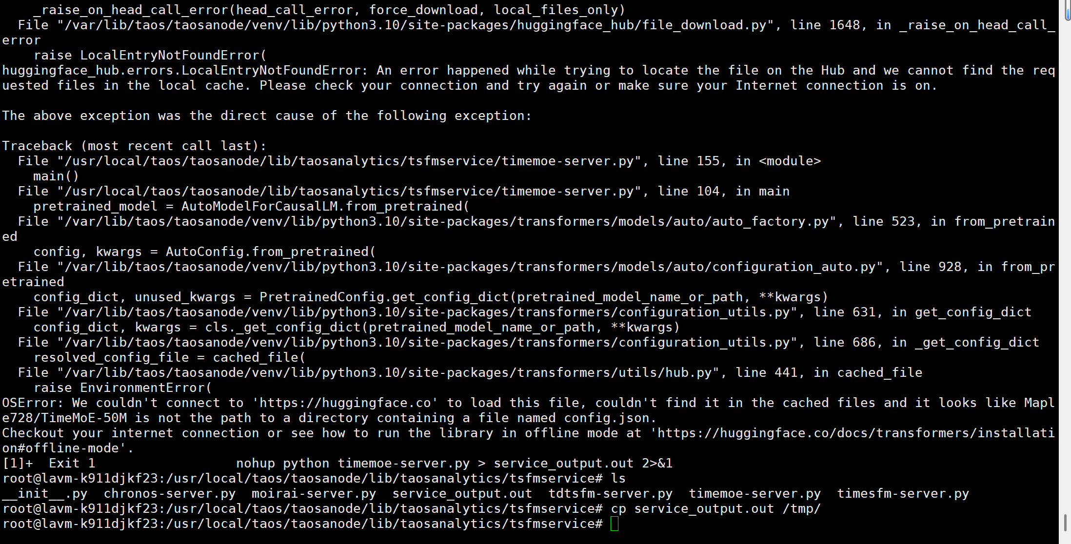 【问题复现路径/shan】部署完成后,跑进去样例数据以及我自己导入了 600 条数据时还能够使用,后续我又导入了8w条数据后,time-moe模型无法使用,tdtsfm_1 模型可以使用,我尝试手动启动time-moe模型,也是无法启动,报错如下信息