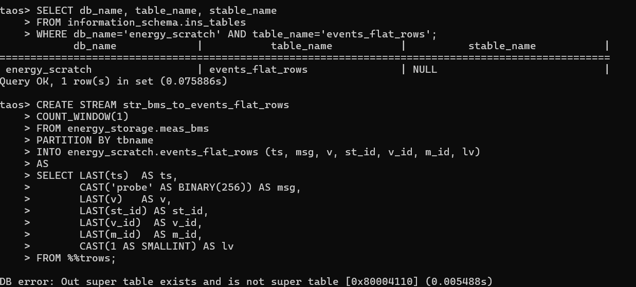 meas_bms是超级表,我希望实现的流是meas_bms子表中写入数据的时候,将数据写入一张普通表events_flat_rows,但是一直报错 DB error: Out super table exists and is not super table [0x80004110]。也确认了events_flat_rows是普通表,建表语句CREATE TABLE events_flat_rows (ts TIMESTAMP, msg VARCHAR(256), v DOUBLE, st_id SMALLINT, v_id SMALLINT, m_id INT, lv SMALLINT)。为什么会报这个错呢,如何解决?