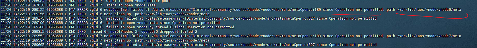 11/20 14:22:19.286114 01953690 C MTA ERROR vgId:4 metaOpenImpl failed at /data/release/main/TDinternal/community/source/dnode/vnode/src/meta/metaOpen.c:189 since Operation not permitted, path:/var/lib/taos/vnode/vnode4/meta