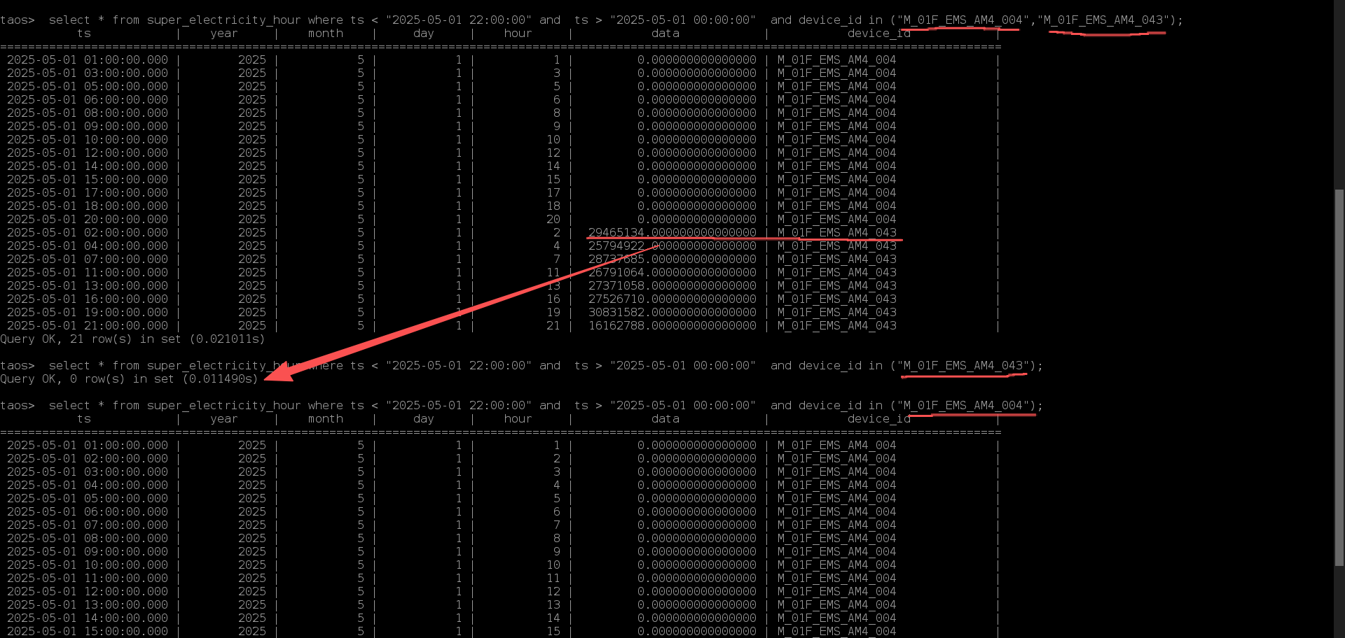 集群环境下,在主服务器上进行 三次相同查询select * from table where device in (a,b),结果却不相同,出现超大数值。三次查询的唯一区别是 device in (a),device in (a,b) ,device in (b) 单独查b的结果一条没有,但是联合查ab时,却出现超大数值结果。a的结果在单独查a和ab时也不一样,部分时间消失了,个数少了。此表目前个数1.6亿条。