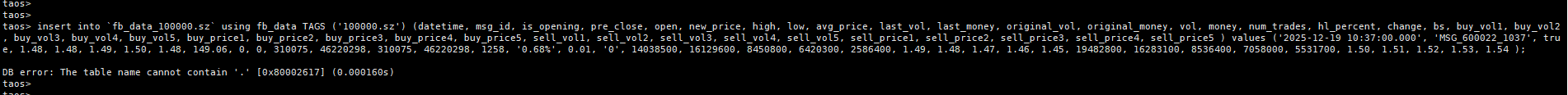 taos> insert into test.`fb_data_100000.sz` using meters tags(11, '100000_sz') (ts, current) values('2025-12-22 10:38:18.000', 22);