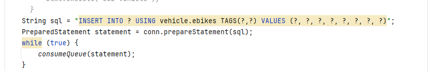 sql: INSERT INTO ? USING ebikes TAGS(?,?) VALUES (?, ?, ?, ?, ?, ?, ?, ?)