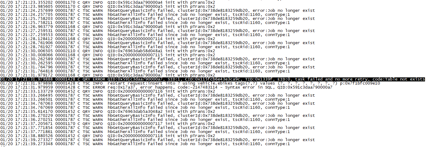 我通过 ws 进行数据写入,使用自动创建子表语句,一开始写入正常,sql: INSERT INTO ? USING ebikes TAGS(?,?) VALUES (?, ?, ?, ?, ?, ?, ?, ?)