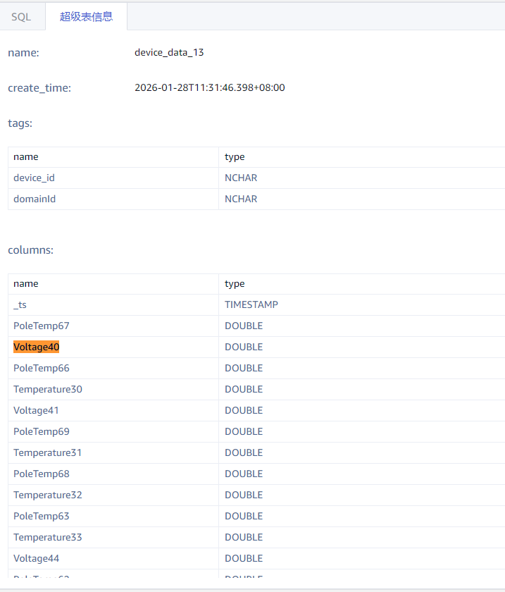 其中一条插入报文:device_data_13,device_id=10162977,domainId=13 Voltage40=3269.0f64,Voltage41=3266.0f64,Voltage44=3266.0f64,Voltage45=3266.0f64,Voltage42=3266.0f64,Voltage43=3267.0f64,Voltage37=3266.0f64,Voltage38=3266.0f64,Voltage35=3266.0f64,Voltage36=3267.0f64,Voltage39=3267.0f64,Voltage30=3267.0f64,Temperature20=30.4f64,Temperature21=30.9f64,Temperature22=31.0f64,Voltage33=3266.0f64,Temperature23=30.6f64,Voltage34=3266.0f64,Temperature24=30.8f64,Voltage31=3267.0f64,Temperature25=31.0f64,Voltage32=3266.0f64,PoleTemp2=32.2f64,Temperature26=31.5f64,PoleTemp3=31.5f64,PoleTemp1=31.8f64,PackNO=2,Voltage26=3266.0f64,Voltage27=3269.0f64,Voltage24=3266.0f64,Voltage25=3266.0f64,Voltage28=3266.0f64,Voltage29=3267.0f64,Temperature10=30.9f64,Temperature11=30.9f64,Voltage22=3266.0f64,Temperature12=30.9f64,Voltage23=3267.0f64,Temperature13=31.5f64,Voltage20=3266.0f64,Temperature14=31.5f64,Voltage21=3266.0f64,Temperature15=30.9f64,Temperature16=30.8f64,Temperature17=31.1f64,Temperature18=30.9f64,Temperature19=30.7f64,Temperature9=30.7f64,Temperature8=30.7f64,Temperature7=30.4f64,Temperature6=31.0f64,Temperature5=31.0f64,Temperature4=30.8f64,Voltage15=3266.0f64,Voltage16=3266.0f64,Voltage13=3267.0f64,Voltage14=3269.0f64,Voltage19=3267.0f64,Voltage17=3266.0f64,Voltage18=3267.0f64,Voltage2=3266.0f64,Voltage51=3267.0f64,Voltage3=3266.0f64,Voltage52=3266.0f64,Voltage4=3266.0f64,Voltage5=3266.0f64,Voltage50=3266.0f64,Voltage11=3266.0f64,Voltage12=3266.0f64,Voltage1=3268.0f64,Voltage10=3266.0f64,Temperature3=30.9f64,Temperature2=31.0f64,Temperature1=31.3f64,Voltage6=3267.0f64,Voltage7=3266.0f64,Voltage8=3267.0f64,Voltage9=3266.0f64,Voltage48=3266.0f64,Voltage49=3267.0f64,Voltage46=3267.0f64,Voltage47=3267.0f64,update_ts=1769583608074u,transactionId=“test12345678” 1769583608000