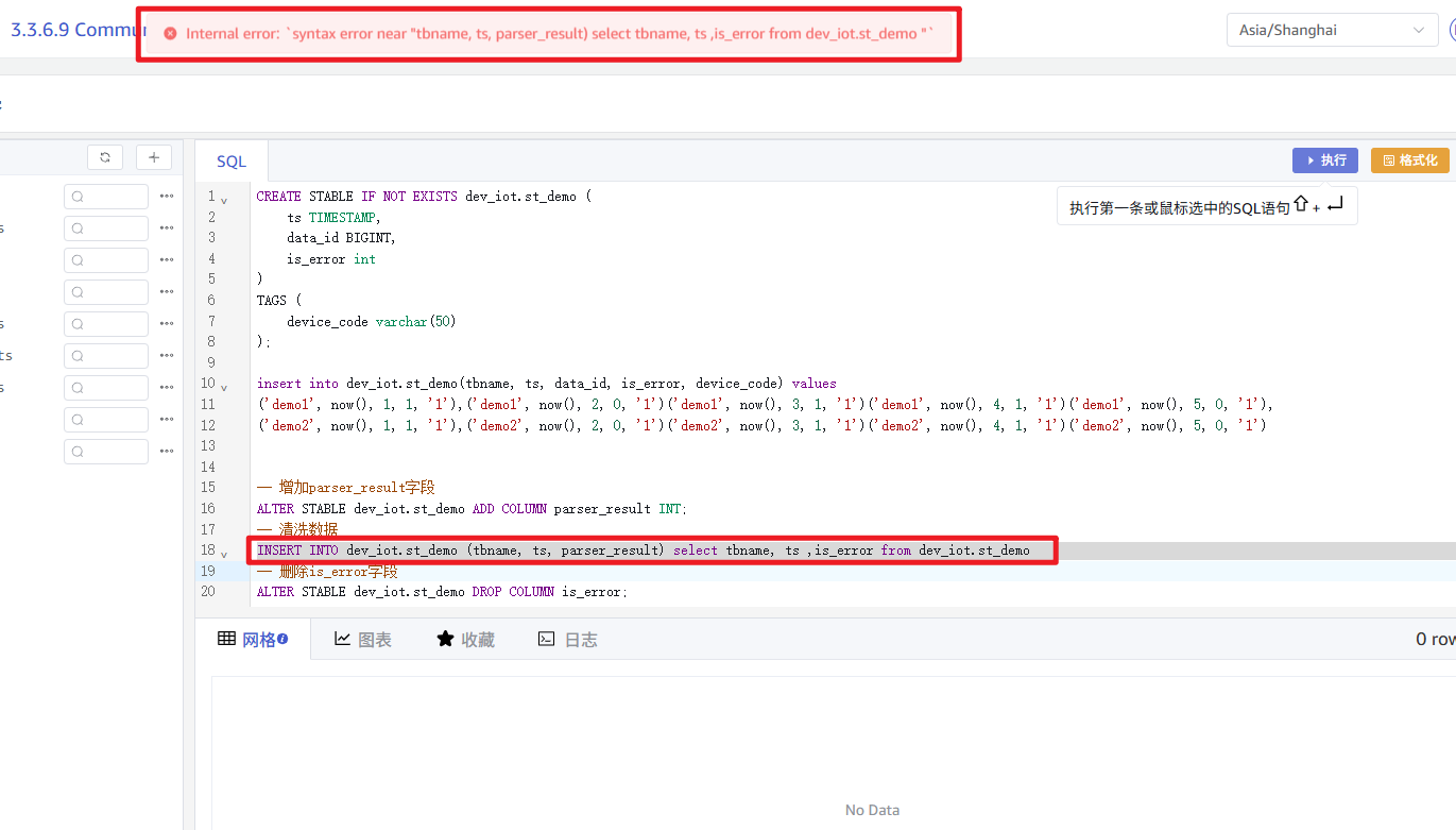 清洗数据时插入子查询,报语法错误:SQL 错误 [9728]: TDengine ERROR (0x2600): syntax error near "tbname, ts, parser_result) select tbname, ts ,is_error from dev_iot.st_demo