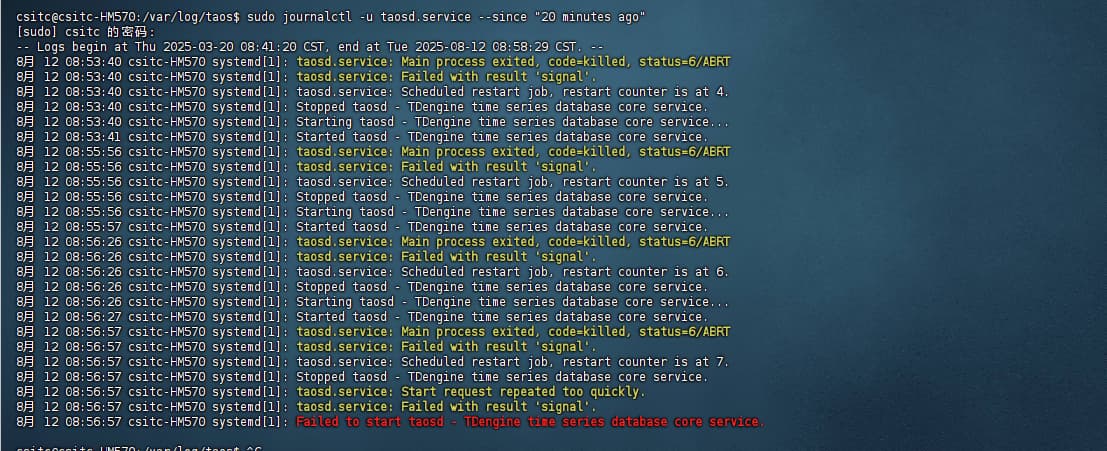 服务不知道为啥突然挂掉了,restart不了,我先执行systemctl reset-failed taosd.service,再执行restart才启动,昨天已经发生过一次,请大佬帮忙分析下具体原因,小白不太懂
