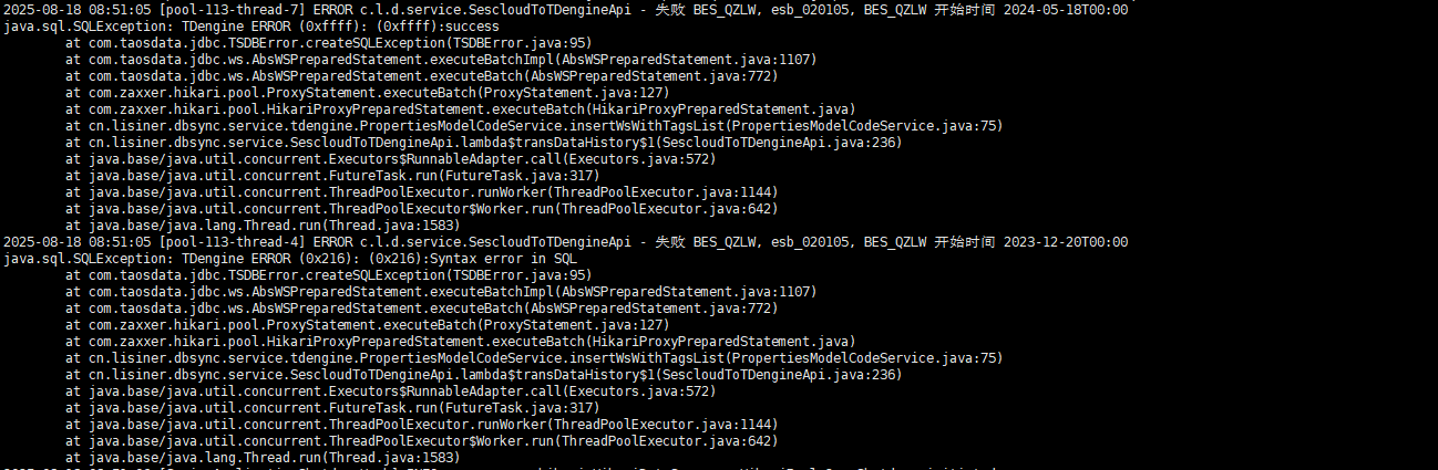 【描述业务影响】使用java版本连接池通过datasource获取connect大批量导入数据开始正常,过一段时间后,抛出异常,且无法通过超级表查询数据和数量,错误码在官方文档中无法查到