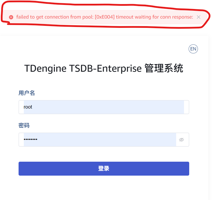 安装完tsdb最新版3.3.3.7.5后,使用浏览器链接数据库登录时报错如下:failed to get connection from pool: [0xE004] timeout waiting for conn response:,啥原因?乍解决?如下图所示。