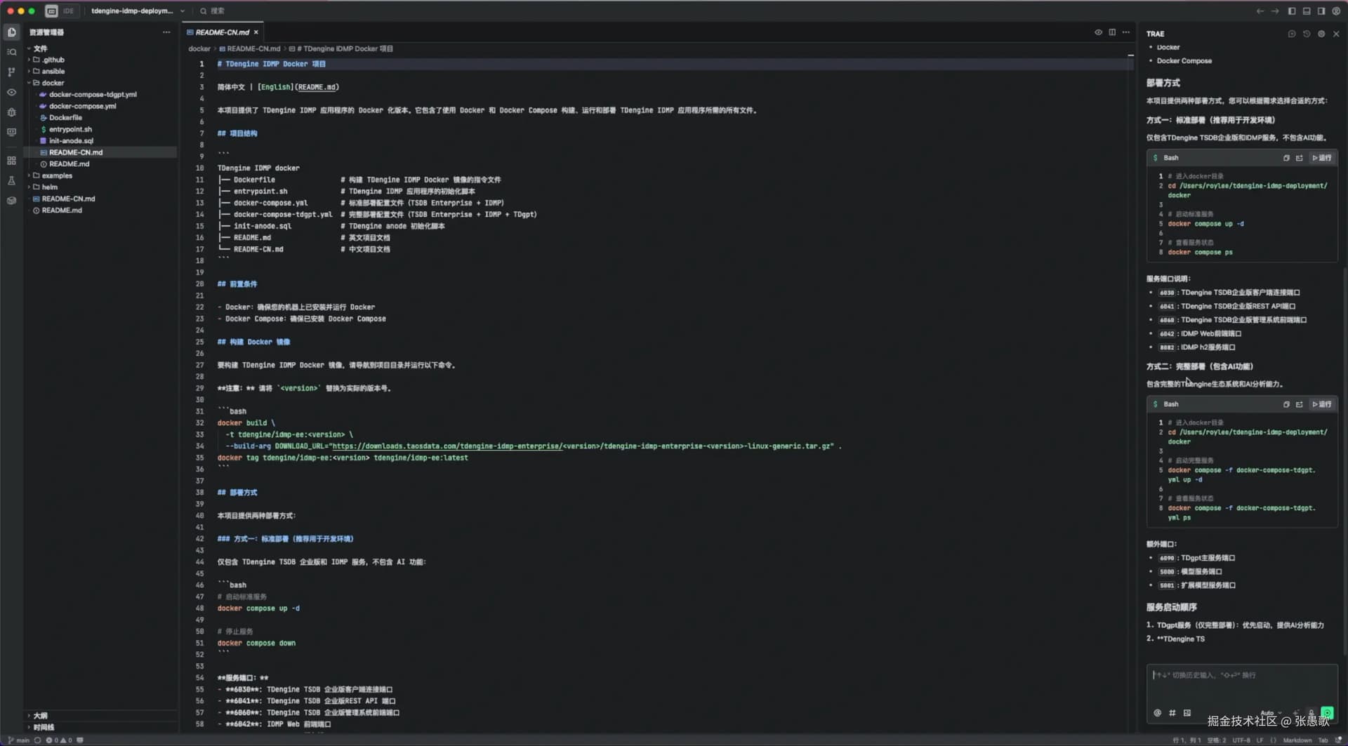 在右侧 AI 对话框中输入:通过 readme 文件,部署 TDengine IDMP,输出后 AI 会根据问题以及当前文件目录进行检索和分析,给出相应的安装步骤。