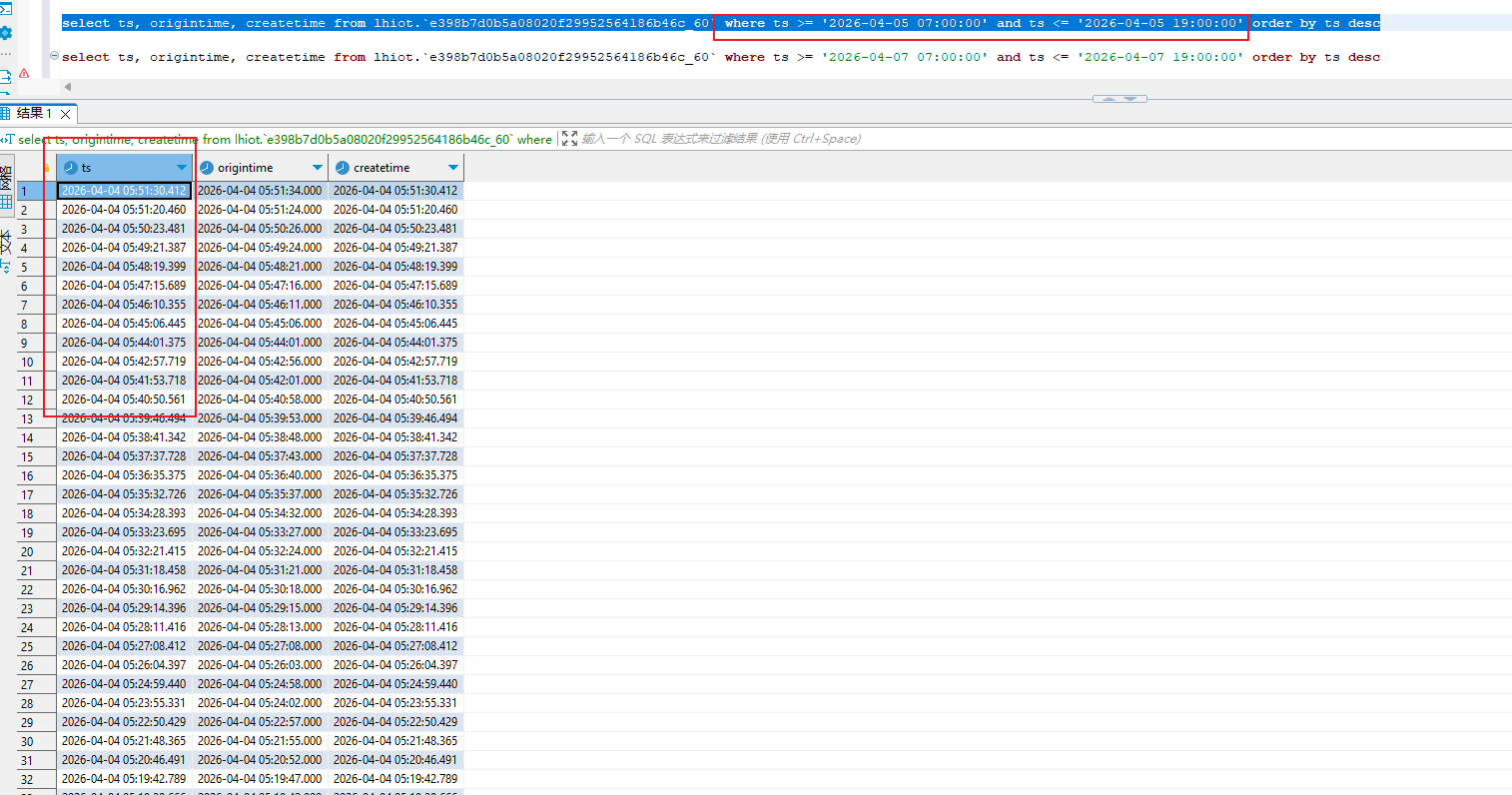 设备在5号的时候没有数据,通过ts查询5号数据的时候会返回4号的数据,查询存在的数据是正常的