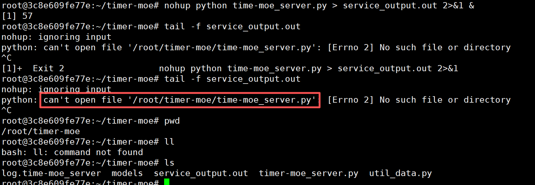 ubuntu22.04 服务器使用 docker 部署了 tdgpt-full ,里边两个时序大模型如何启动呢,在docker 内的/root/timer-moe 目录下看到了py 脚本,启动的时候说找不到,如何处理