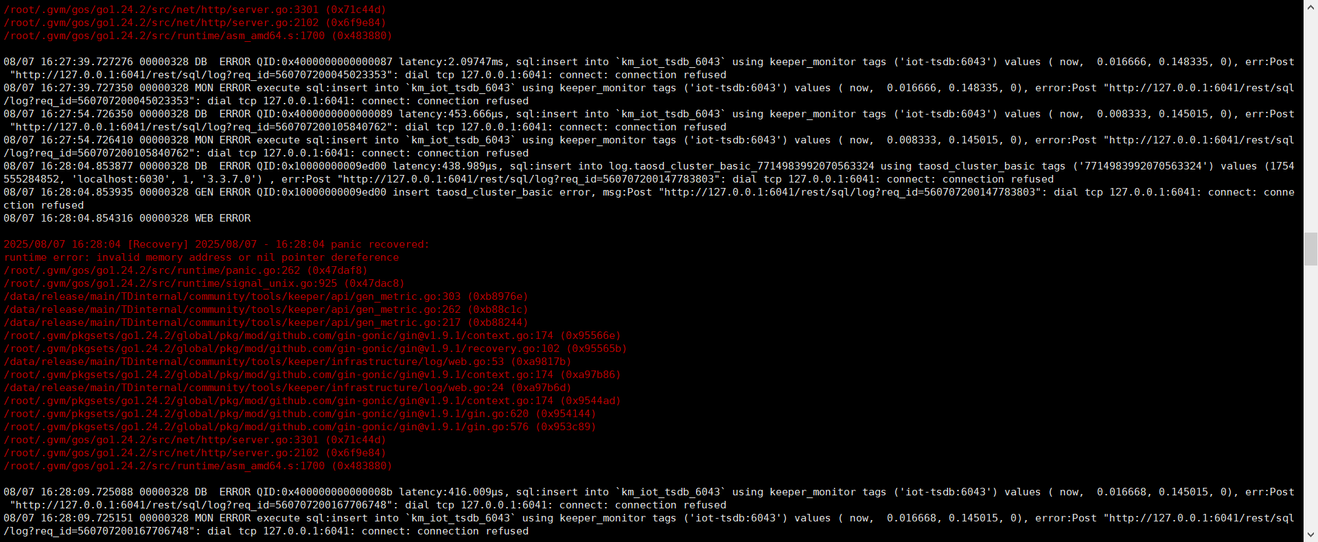 09/03 18:18:53.786668 00000321 DB ERROR QID:0x10000000000ea00 latency:429.519µs, sql:insert into log.taosd_cluster_basic_5088643727513000061 using taosd_cluster_basic tags (‘5088643727513000061’) values (1756894733785, ‘localhost:6030’, 1, ‘3.3.7.0’) , err:Post “http://127.0.0.1:6041/rest/sql/log?req_id=4697554515246710867”: dial tcp 127.0.0.1:6041: connect: connection refused
