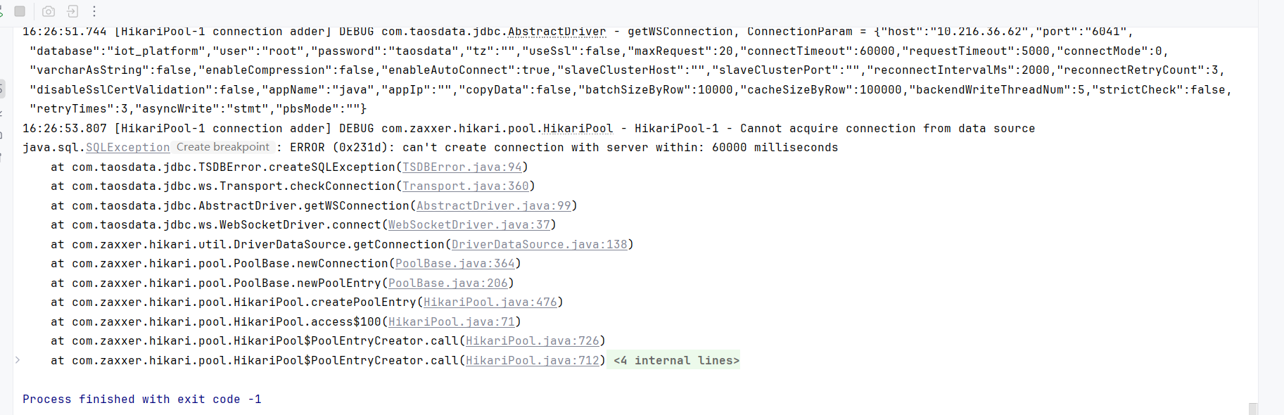 config.setJdbcUrl("jdbc:TAOS-WS://10.216.36.62:6041/iot_platform?characterEncoding=UTF-8&useUnicode=true&useSSL=false&zeroDateTimeBehavior=convertToNull&serverTimezone=Asia/Shanghai&useInformationSchema=true");