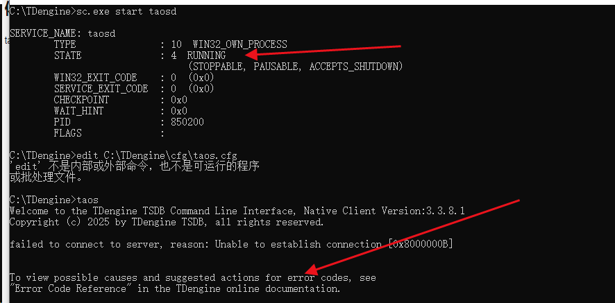 执行 taos 命令时,未使用任何命令行参数,其默认会与本机运行的 taosd 进程建立连接,从报错 unable to establish connection 判断,连接建立失败。
